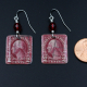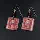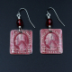These earrings were made with recycled postage stamps. The stamps were mounted on metal that was hand cut and filed, so no sharp edges. There is a coat of resin to protect the stamps. The ear wires are stainless steel.