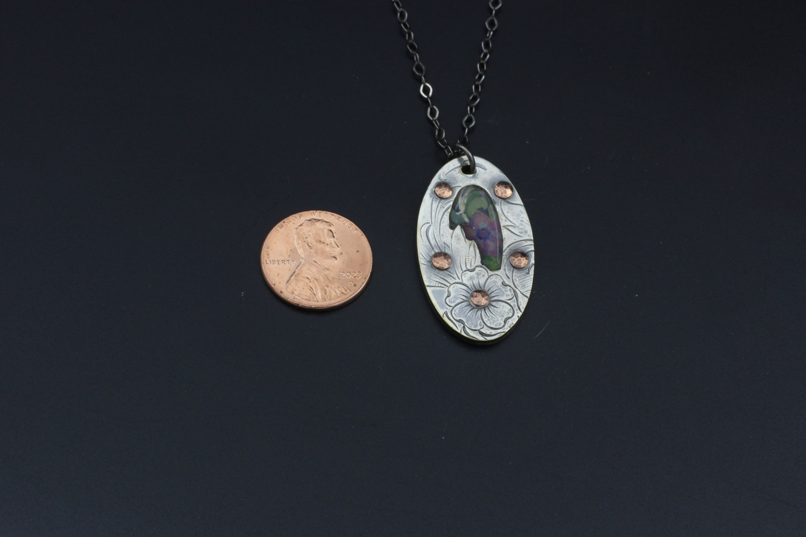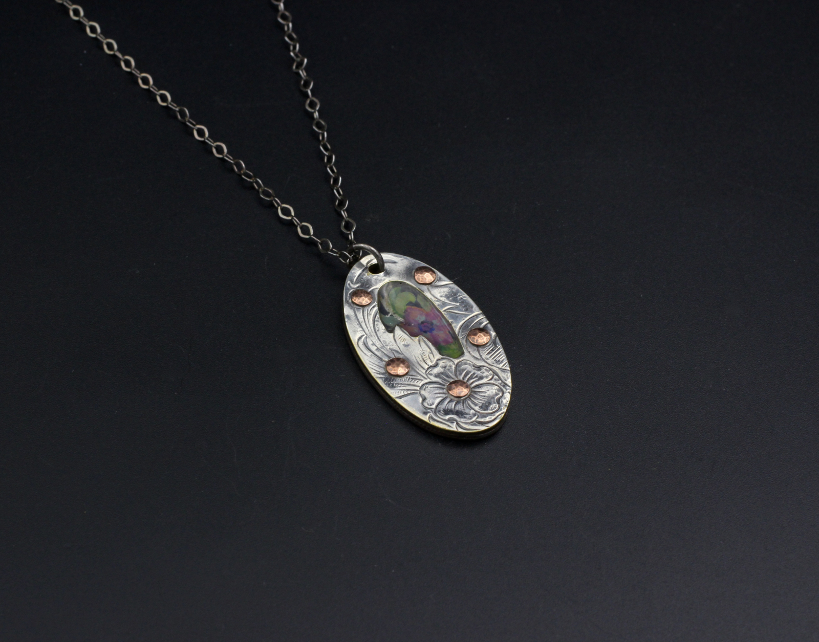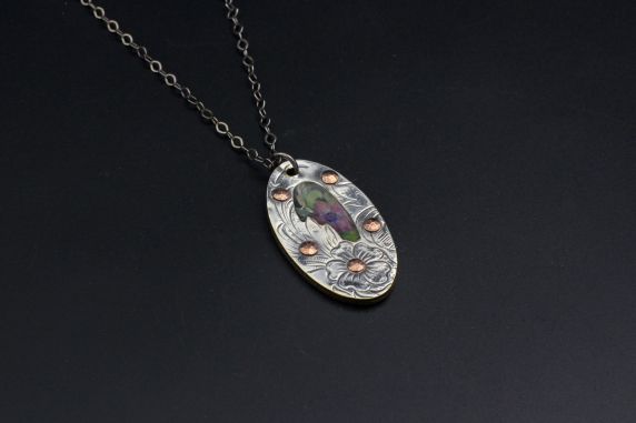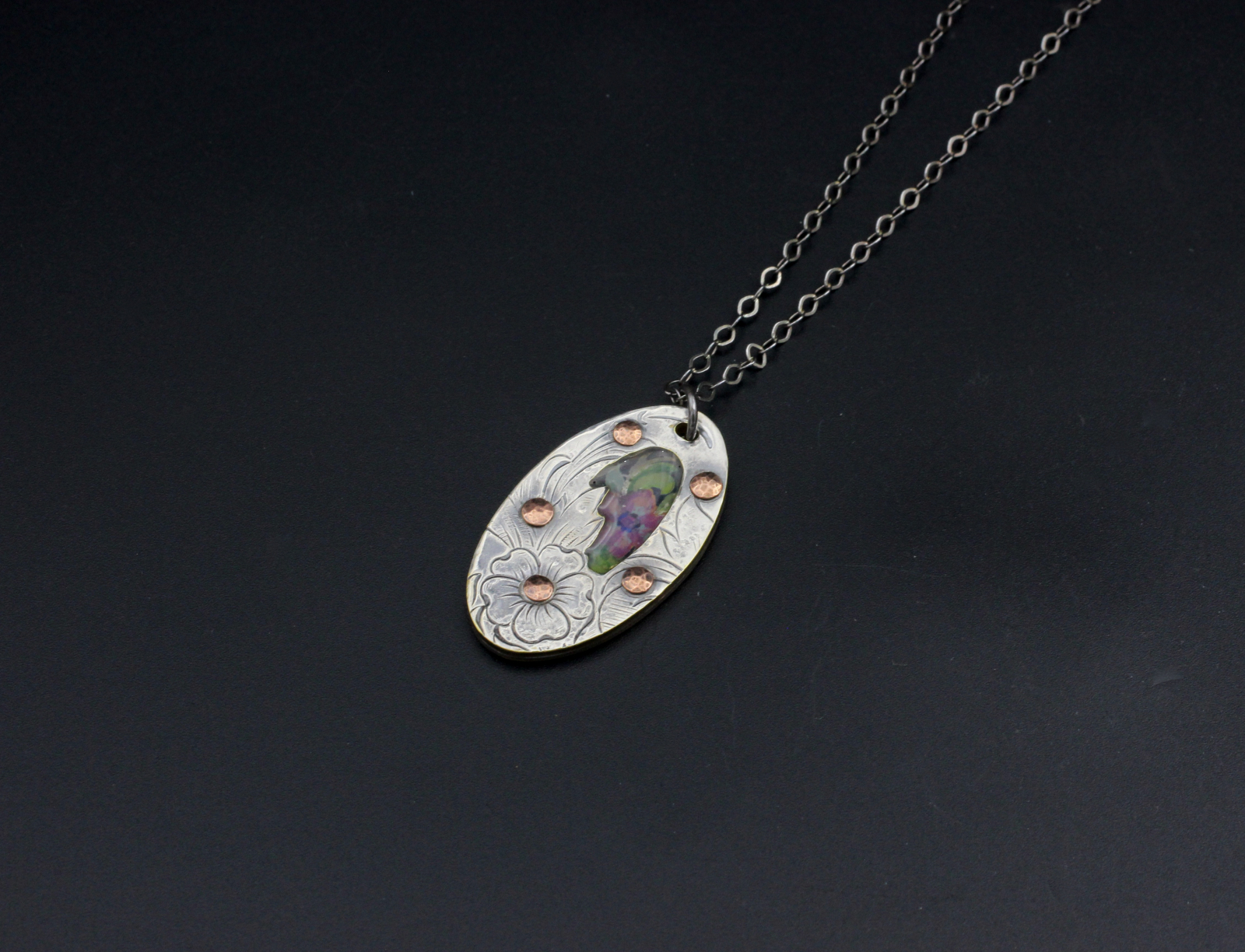 This pendant was created with a silver tray. There are three layers that are riveted together. The center layer was hand painted and has a resin coating. The chain is 20" and silver filled.