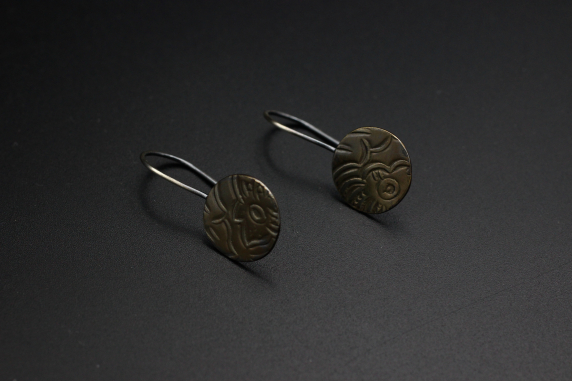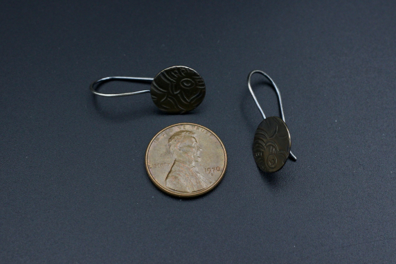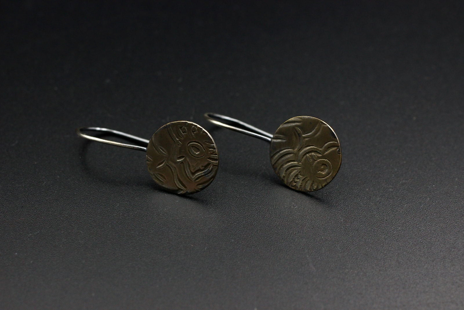 These earrings were made with pieces cut from a vintage etched silver plated tray. Sterling wire was soldered to the backs, and the heat from the torch altered the silver plate on the tray pieces giving them a vintage look. I've applied an antique finish, which adds to the vintage feel. The earwires are sterling silver.