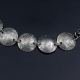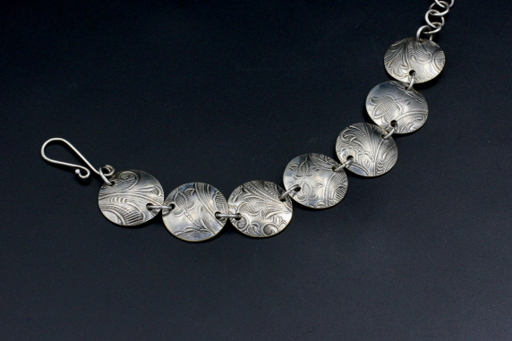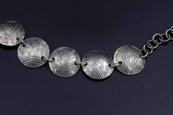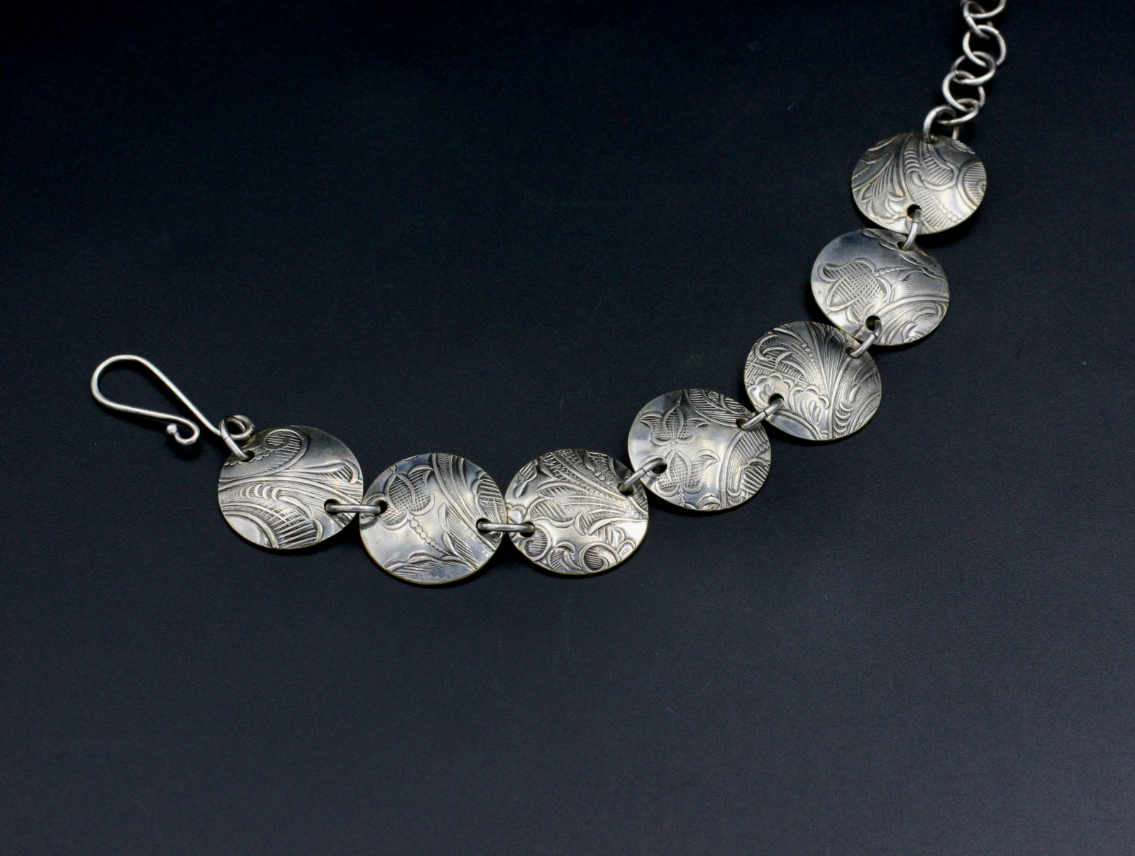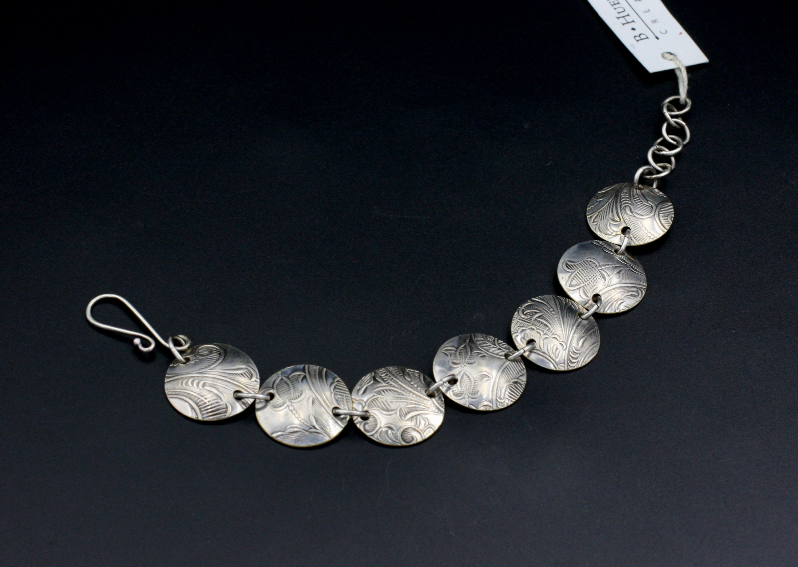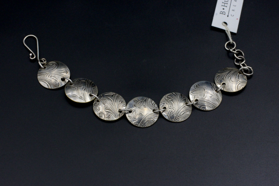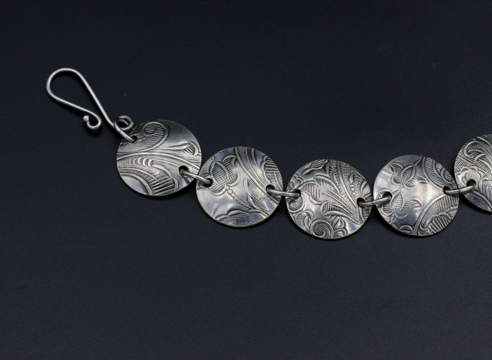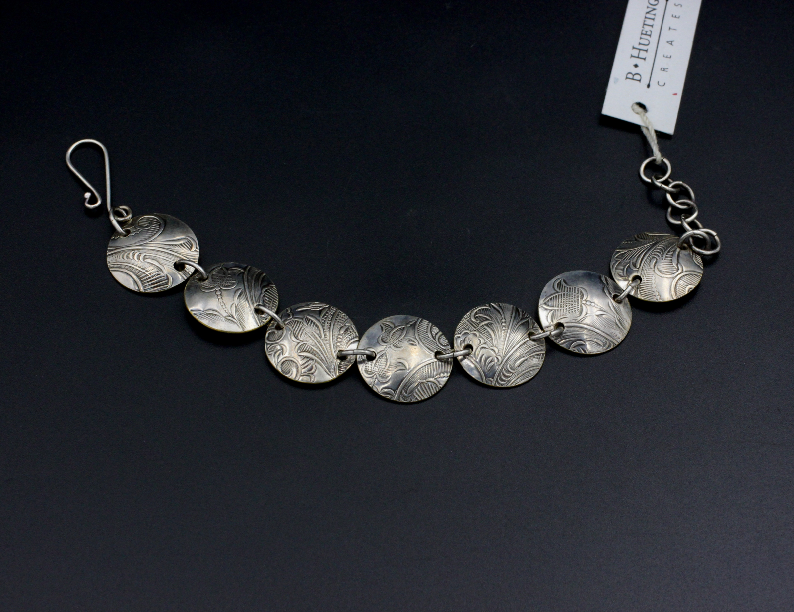 This bracelet was created out of a silver plated vintage tray. Each circle was hand cut and filed. The hook and rings are sterling.