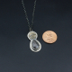 This sterling pendant has a flower that was hand cut from a recycled decorative metal piece, and the gemstone is a purple sapphire. The pendant is 1 3/16" x 9/16". The chain is sterling and measures 18".